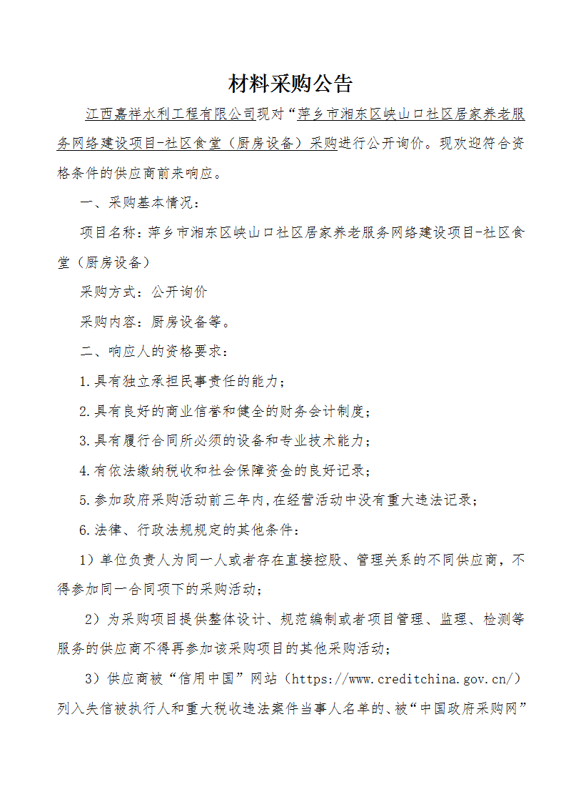 江西嘉祥水利工程有限公司現(xiàn)對“萍鄉(xiāng)市采煤沉陷區(qū)湘東區(qū)冬瓜槽區(qū)避險(xiǎn)搬遷項(xiàng)目進(jìn)行公開詢價。現(xiàn)歡迎符合資格條件的供應(yīng)商前來響應(yīng)。